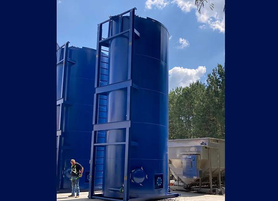 About 6 months later the distillery decided to purchase the rental MBBR and add a second MBBR system. Combined, the two MBBRs could process 100 gallons per minute (gpm). They also decided to purchase media filters and GAC filter, along with an ETS-UV system and chemical feed system to provide disinfection. A 300,000 gallon treated water storage tank was installed outside, which is used to provide treated water throughout the facility.