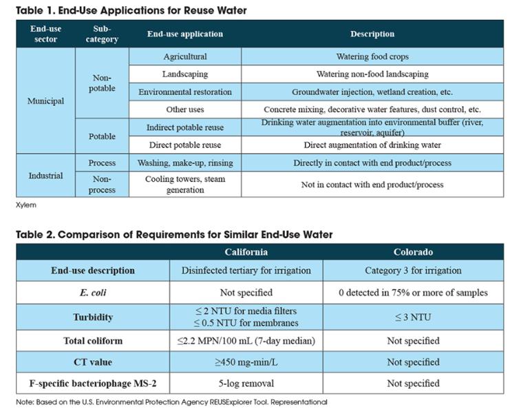 However, getting any water-reuse scheme off the runway is a complex undertaking without one-size-fits-all protocols. Depending on intended end use, water-reuse systems must meet widely varying effluent quality requirements that often differ not only across goals, but also jurisdictions and local regulatory requirements. Effluent requirements vary between California and Colorado with respect to irrigation water used for residential purposes (see Table 2, below). These differences could mean contrasting targets for factors such as turbidity, total coliform, log-reduction value, and more, all of which could necessitate entirely different treatment processes and technologies. For instance, two treatment trains — each designed for direct potable reuse — can take diverging paths to reach different regulatory destinations (see Figure 1, p. 38).